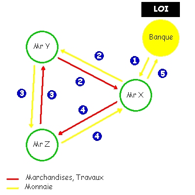 la banque pour se faire construire une maison par Mr Y. Pour rendre l'exemple plus réaliste, introduisons un nouveau personnage, Mr Z. La Banque prête à Mr X (1) Mr X donne la monnaie à Mr Y (maçon) qui lui construit sa maison (2) Mr Y donne la monnaie à Mr Z (charpentier) qui lui fabrique un bateau (3) Mr Z donne la monnaie à Mr X (bûcheron scieur) qui lui a procuré le bois (4). Mr X ayant récupéré la monnaie, il peut la rendre à la banque pour solde du compte (5). Ce qui peut se représenter par la fig.1 : |